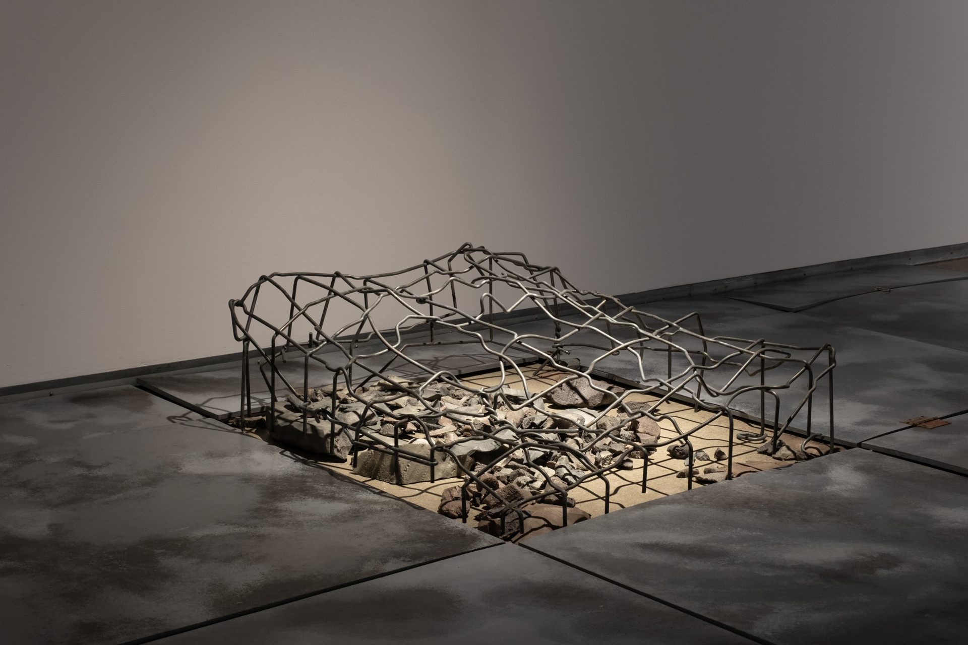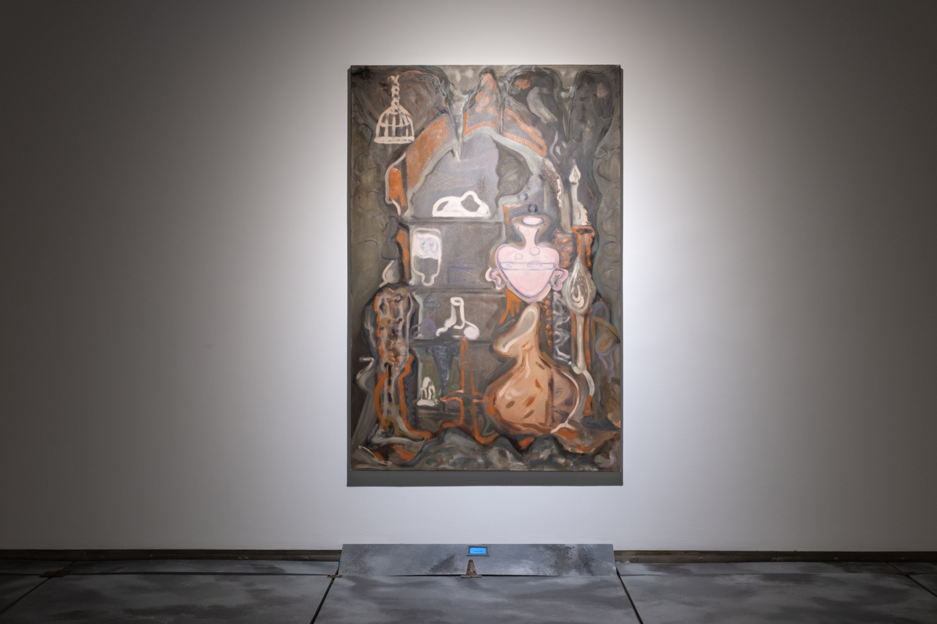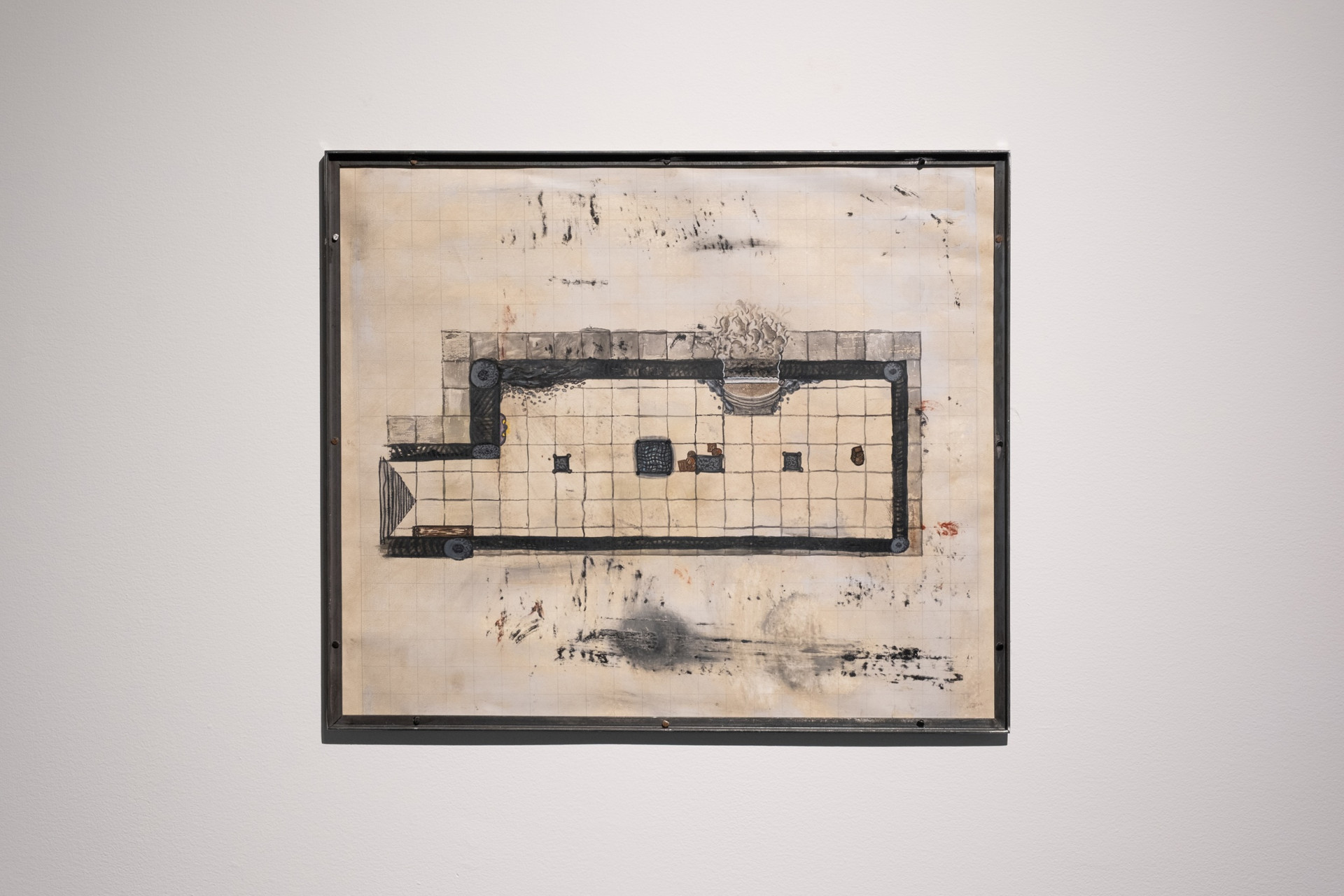 Ici, chacun de vos pas et de vos regards vous engage dans un récit qui est en train de s’écrire et dont la logique interne se révèle au fil de votre progression. À la croisée de la fiction spéculative et du jeu de rôle, l’espace qui vous entoure forme un environnement hypermédiatique qui intègre à la fois des œuvres graphiques, picturales, sculpturales et vidéos s’inspirant des mécaniques narratives et sociales du jeu Donjons & Dragons1. Une vaste installation recouvrant le sol de la galerie évoque ainsi l’espace quadrillé d’un plateau de jeu, qui agit comme une trame reliant entre elles les différentes œuvres de l’exposition. Celles-ci se manifestent, sous des formes sublimées et parfois quasi abstraites, comme des vestiges d’un univers parallèle : un golem qui tente de s’extirper de sa propre matière, un portail menant vers un au-delà indéterminé, un inventaire d’objets en constante métamorphose, ou encore des oubliettes au fond desquelles se terrent quelques songes lointains… Chaque élément semble appartenir à une mythologie fragmentée dont il vous revient de recomposer les liens.